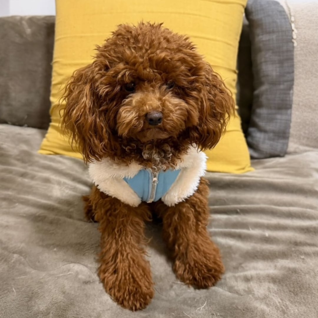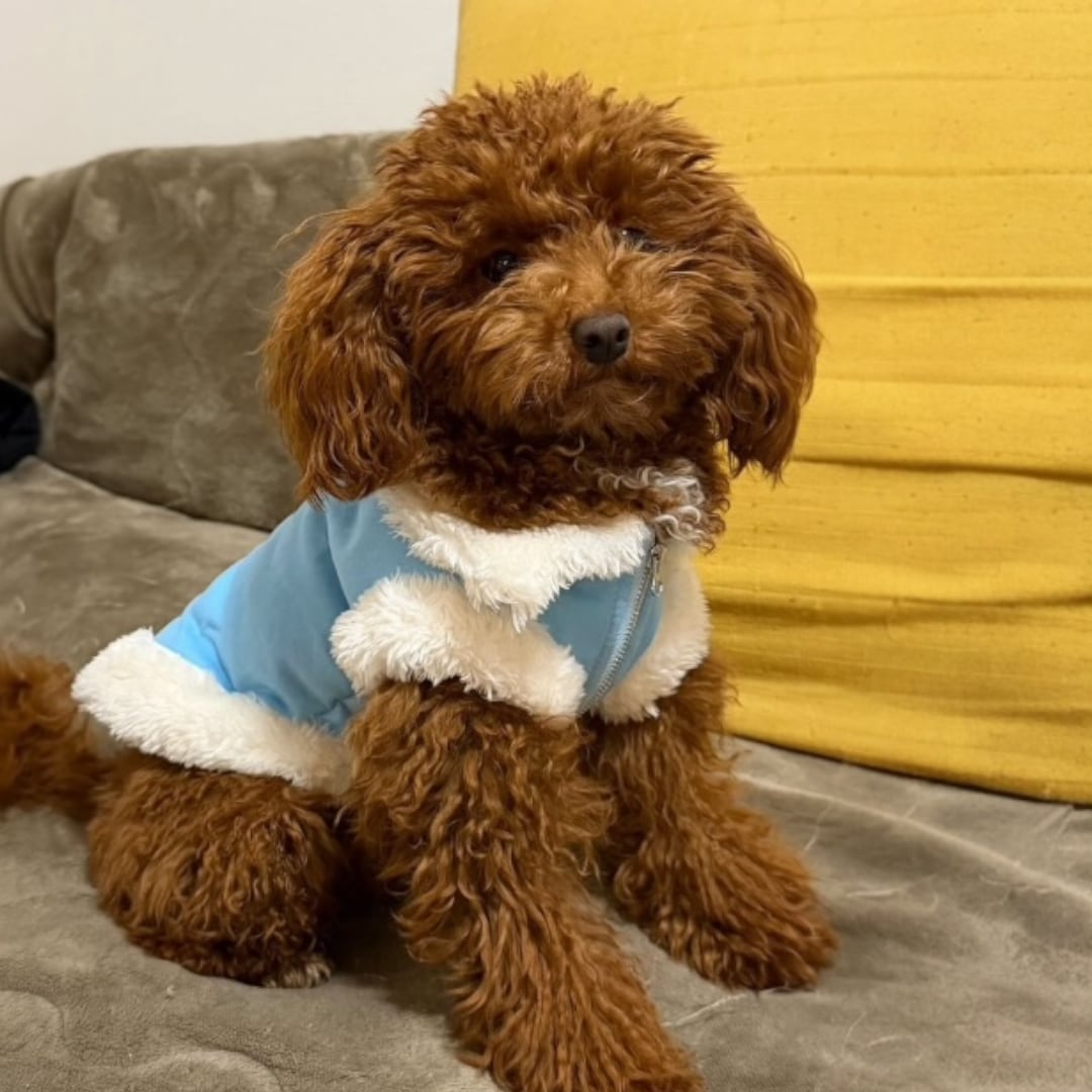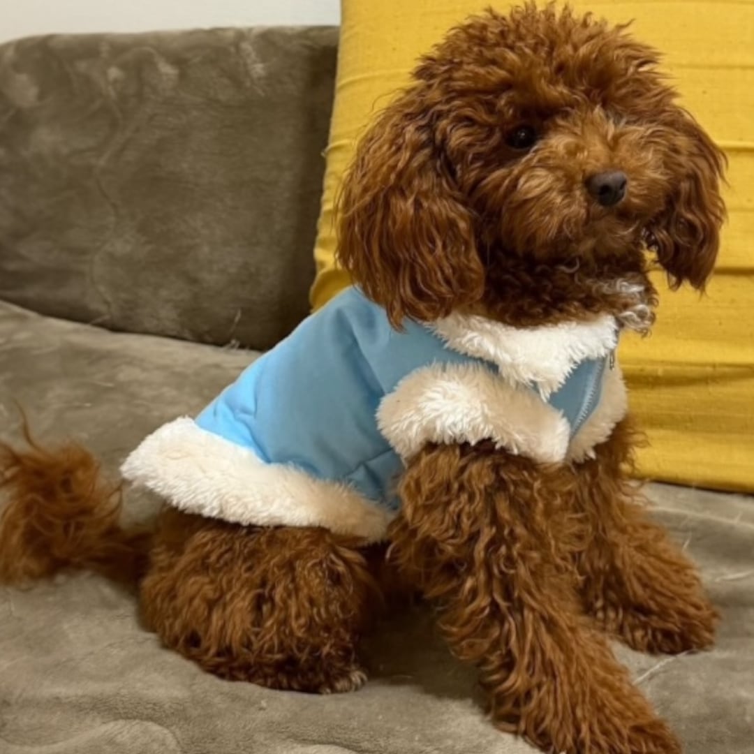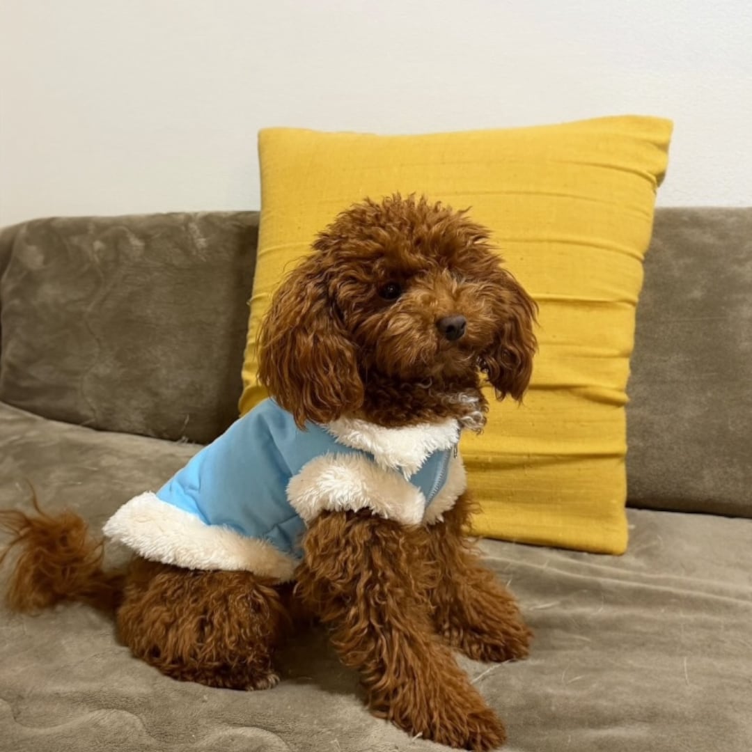 淡いライトブルーが愛犬の魅力を引き立て、街中でも写真映えする冬アウターです。