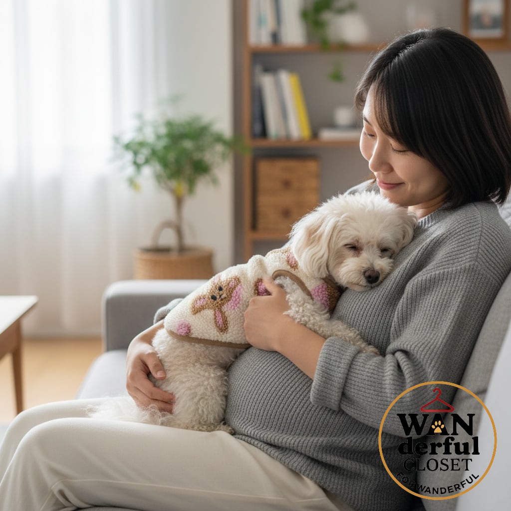 ふんわりとした編み地が愛犬をやさしく包み込み、季節の変わり目やお部屋でのリラックスタイムにも