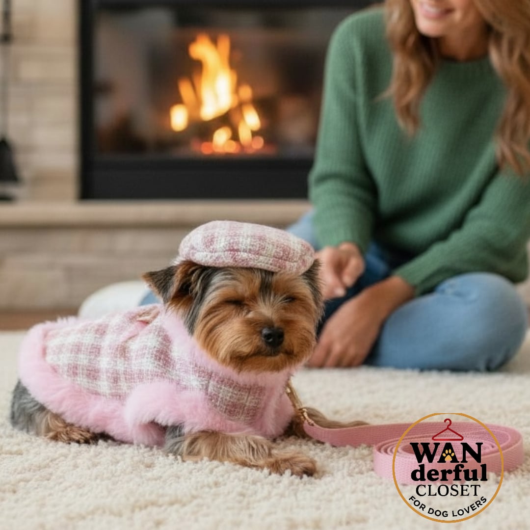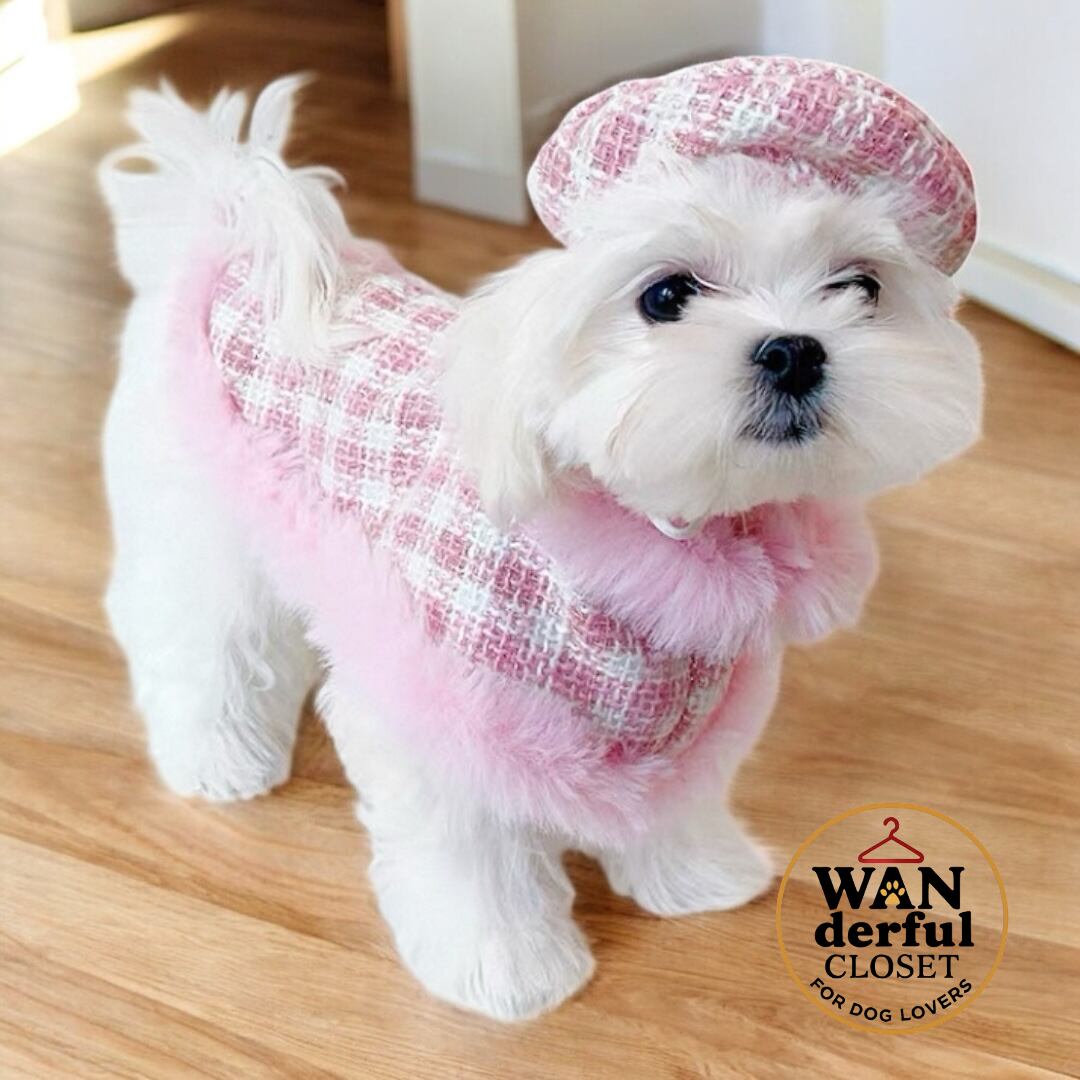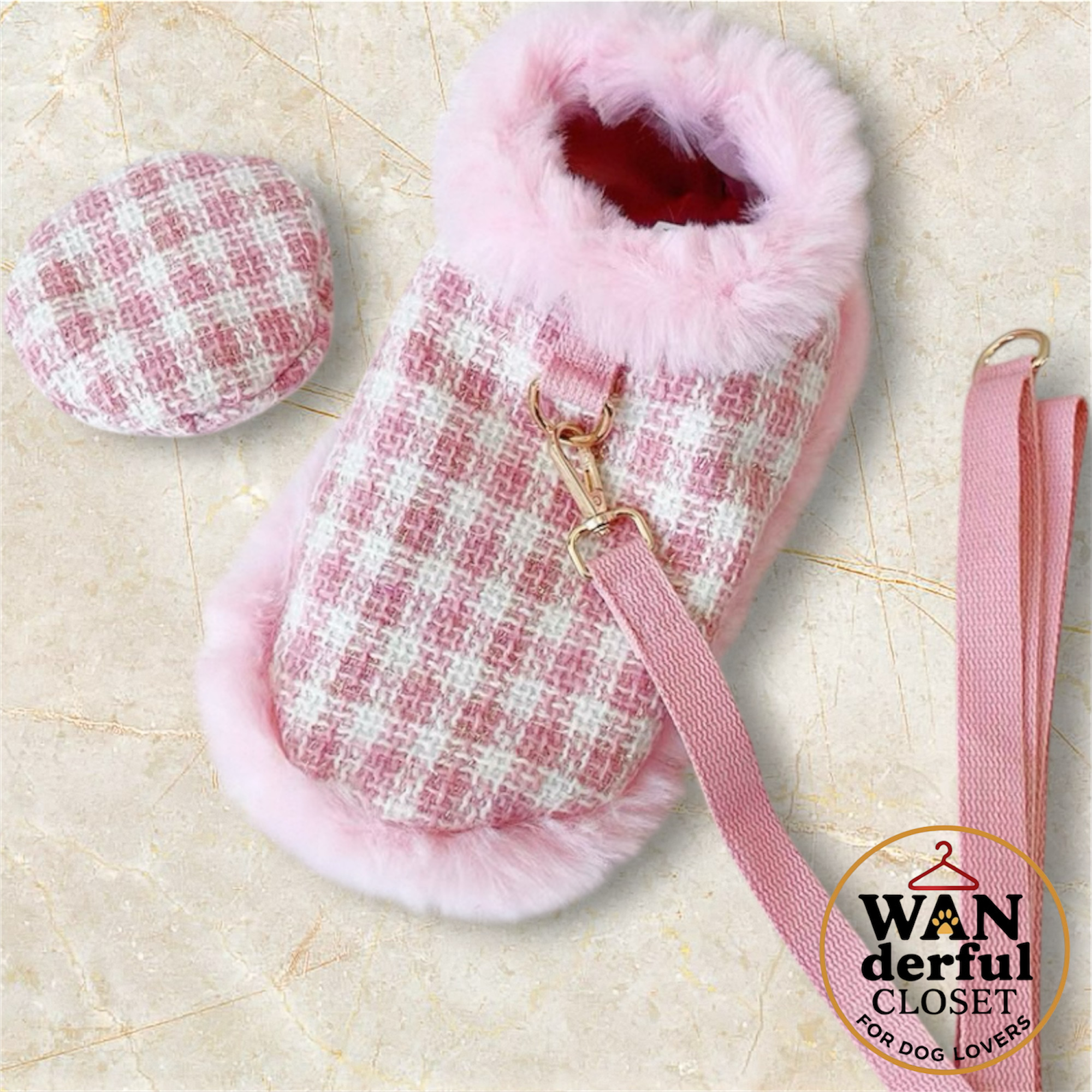 【小型犬・中型犬用|ふわふわ可愛いピンクチェックのケープセット】