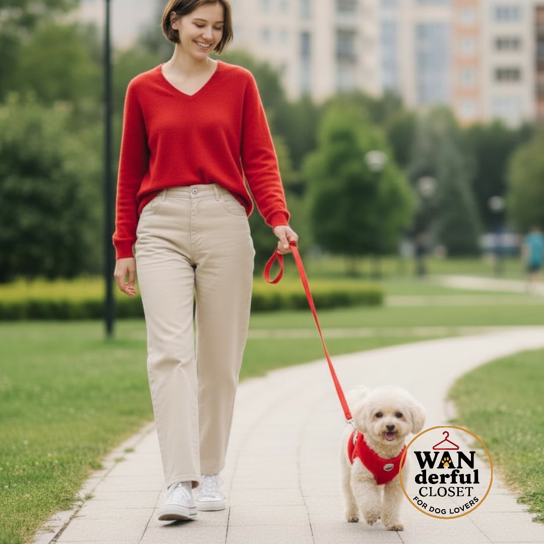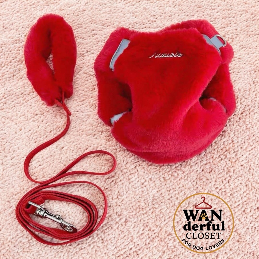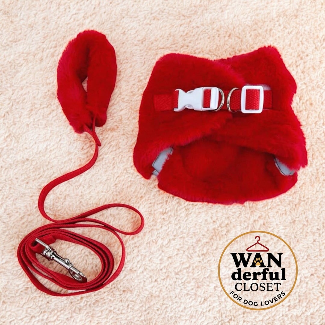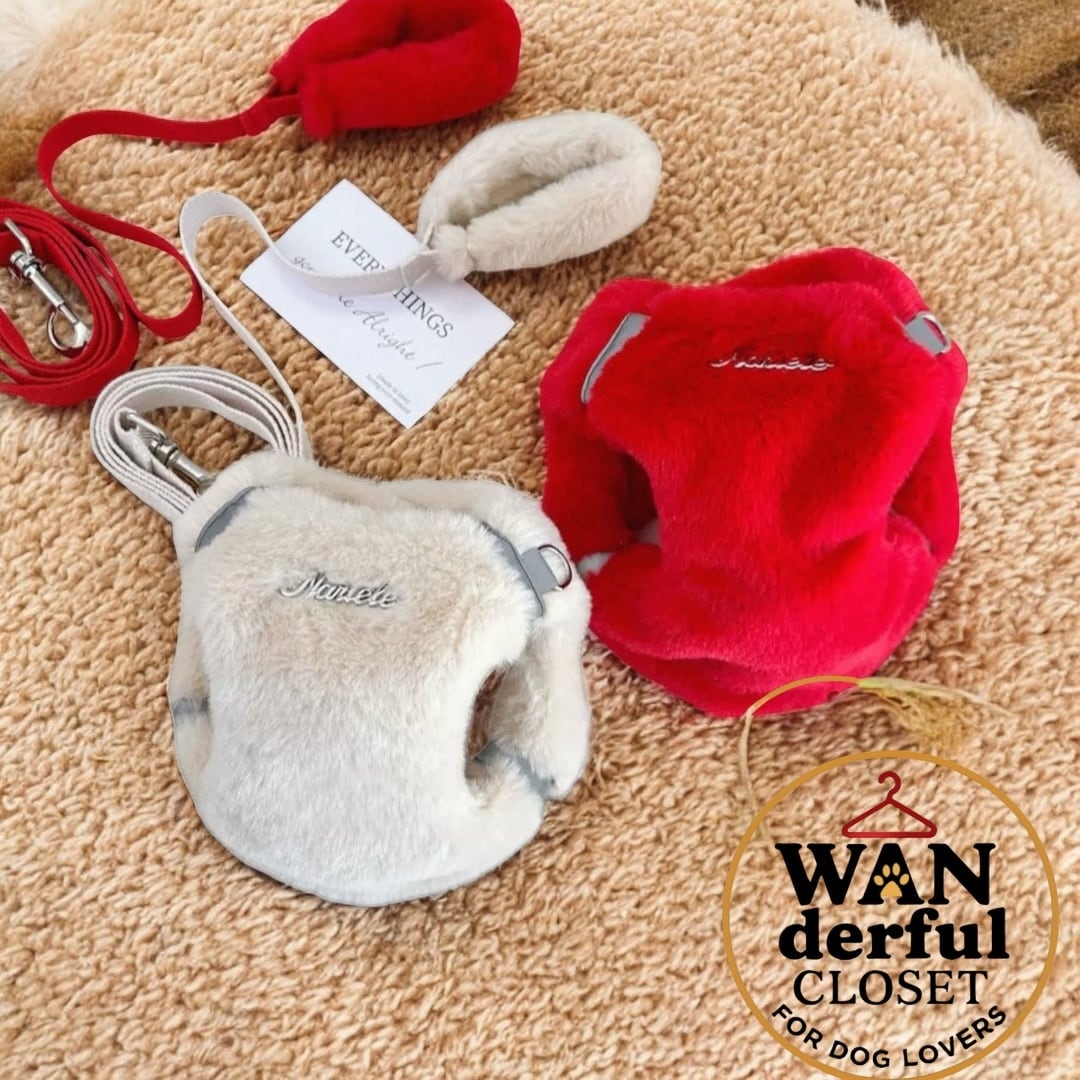 ふんわりもこもこのフリース素材で仕上げた、冬にぴったりの犬用ハーネスセット。