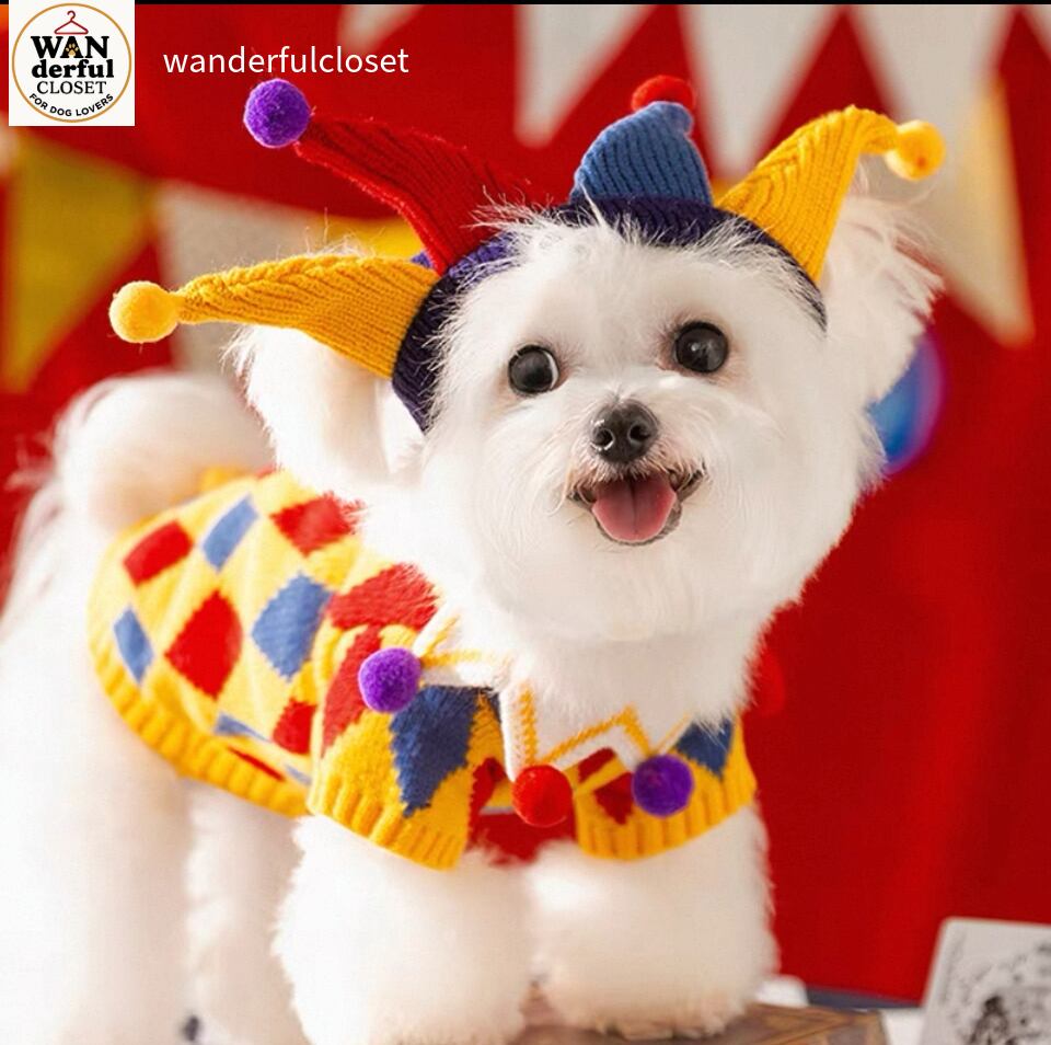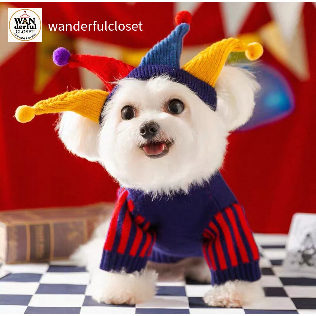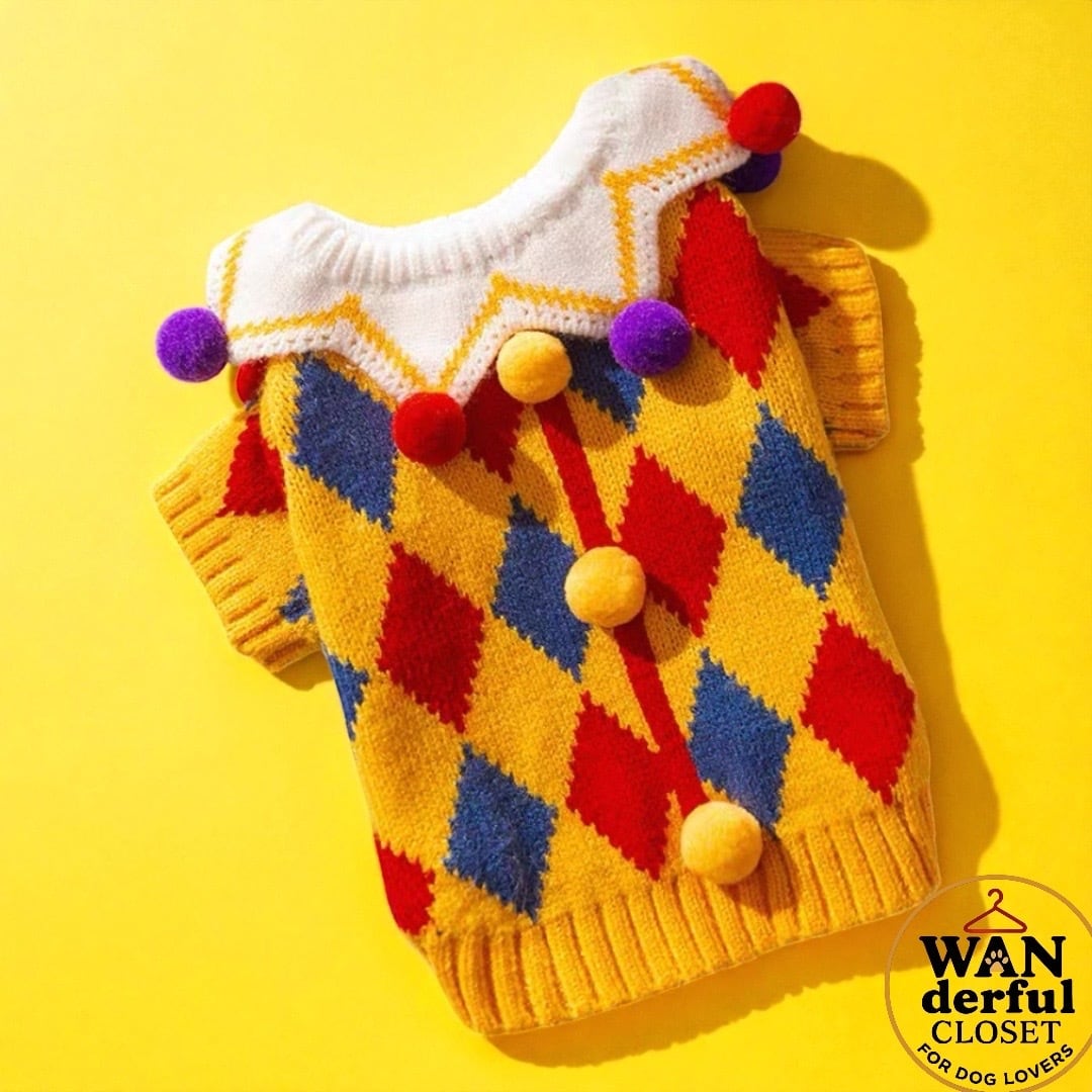 【小型犬・中型犬用|ピエロ&フラワーデザインの遊び心あふれるニットセーター】