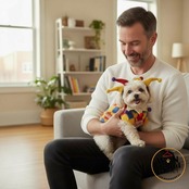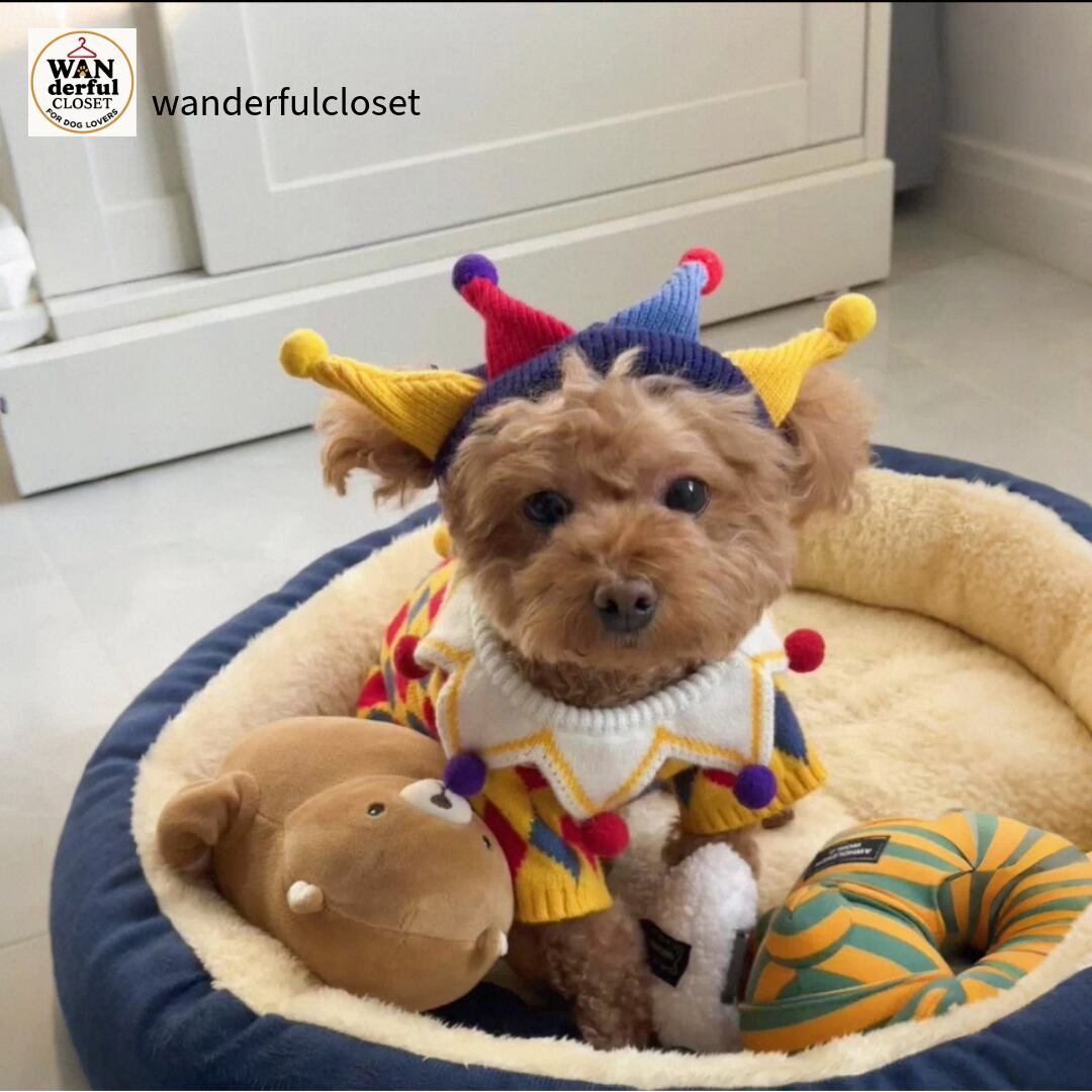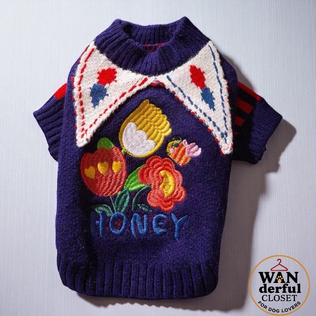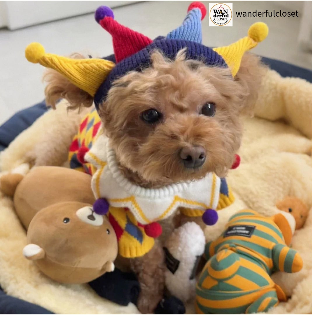 【小型犬・中型犬用|ピエロ&フラワーデザインの遊び心あふれるニットセーター】