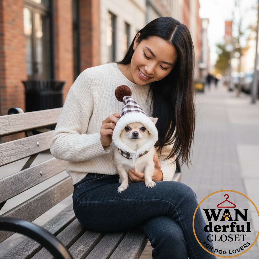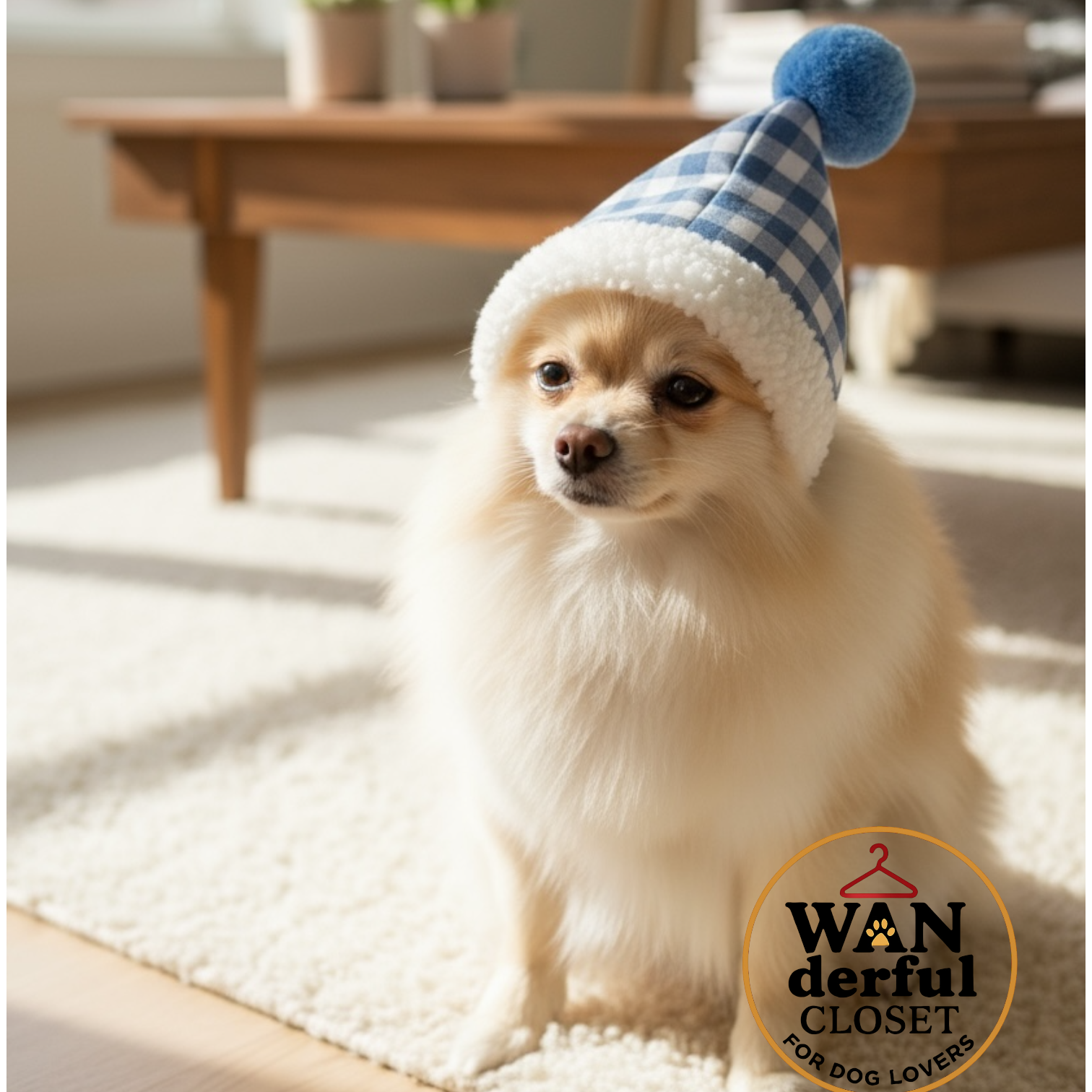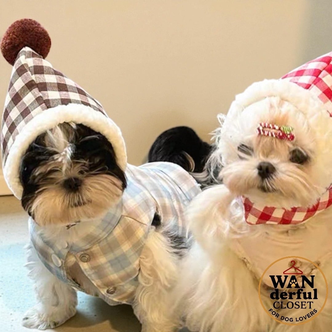 落ち着いたチェック柄に、愛らしいポンポンをあしらった犬用帽子。