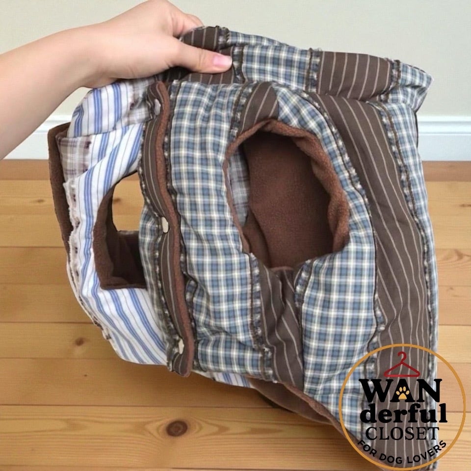 色や柄を組み合わせたパッチワークデザインが目を引く、おしゃれな犬用ベスト。