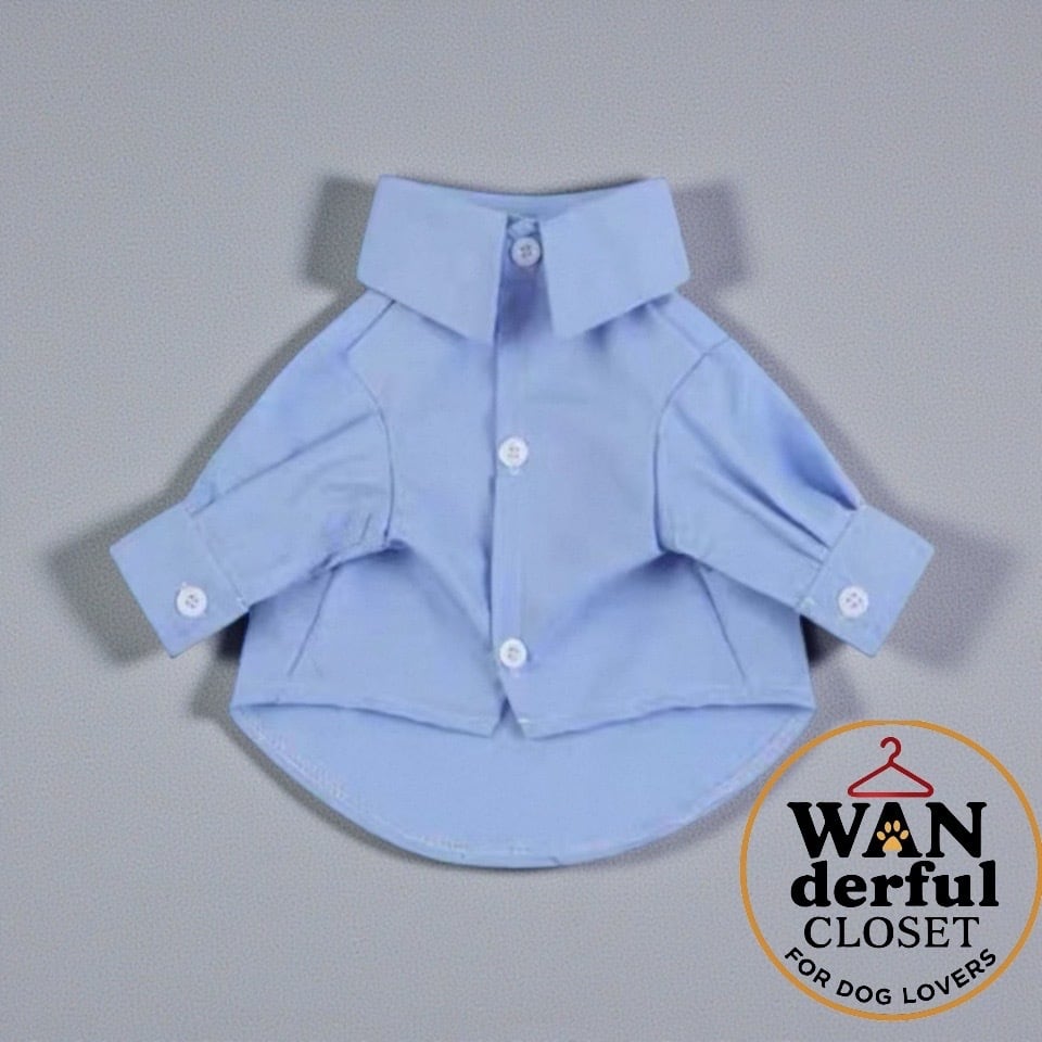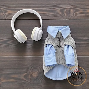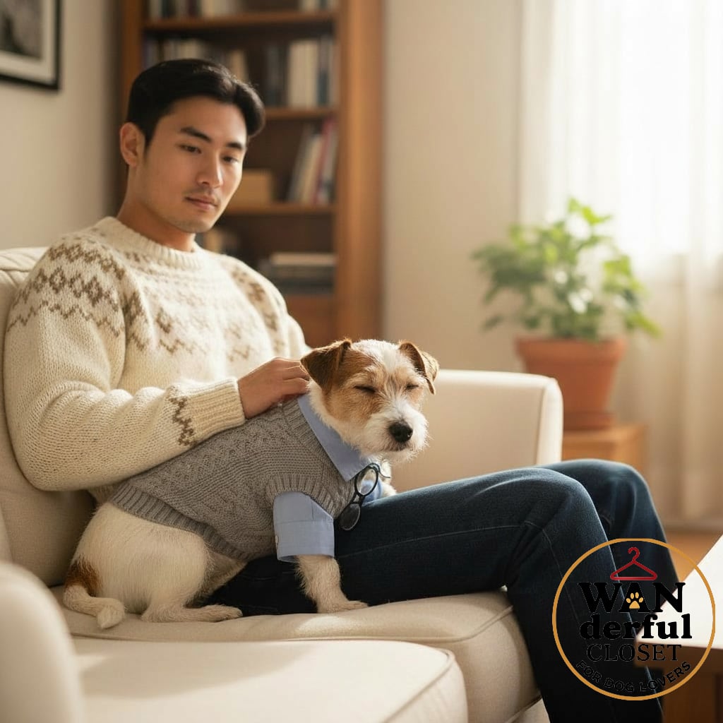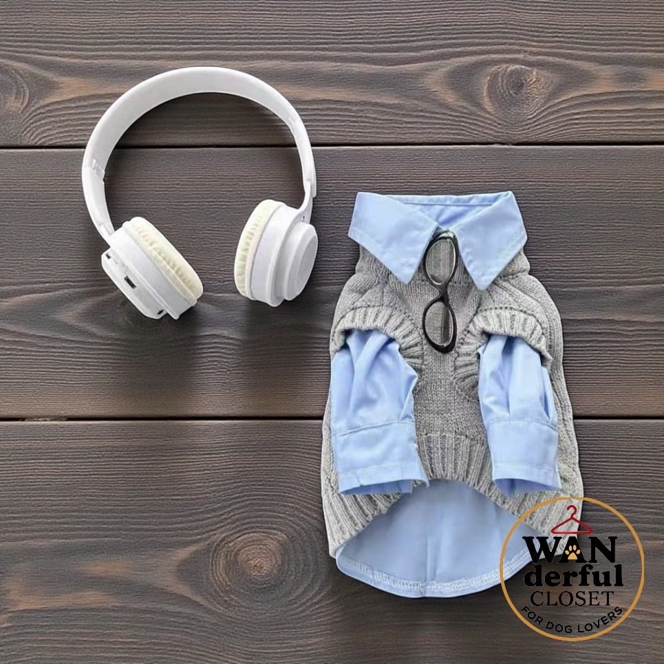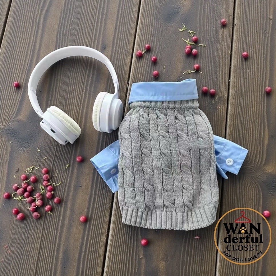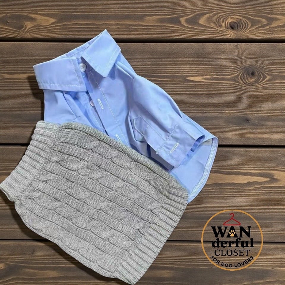 【小型犬・中型犬用|知的な雰囲気をまとうケーブル編みベスト&ブルーシャツセット】