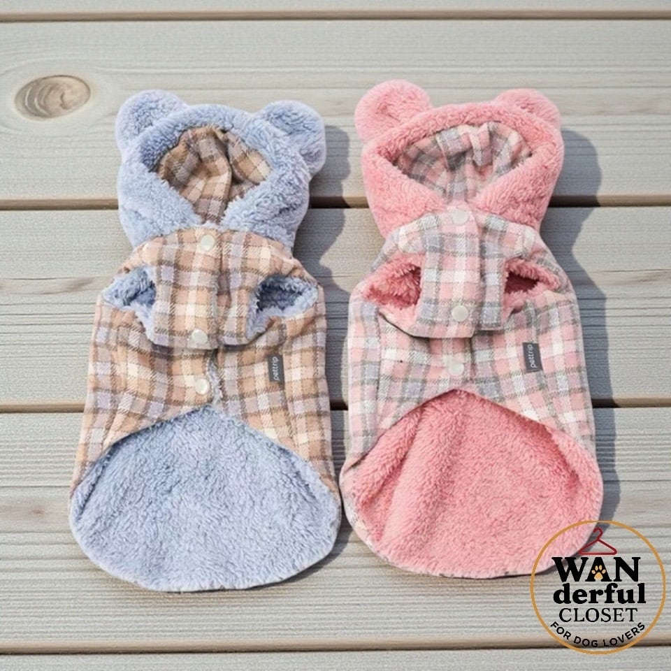 【犬服】チェックベスト 熊耳フード|小型犬・中型犬用 ぬくもり可愛い 1184
