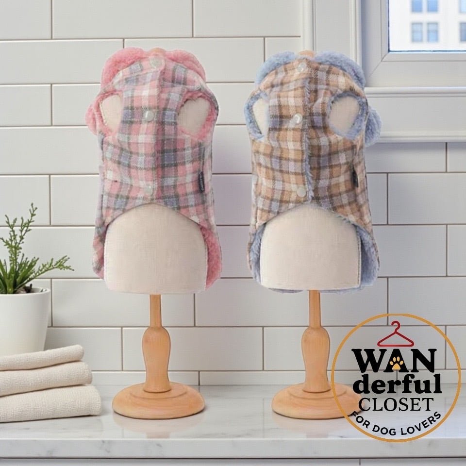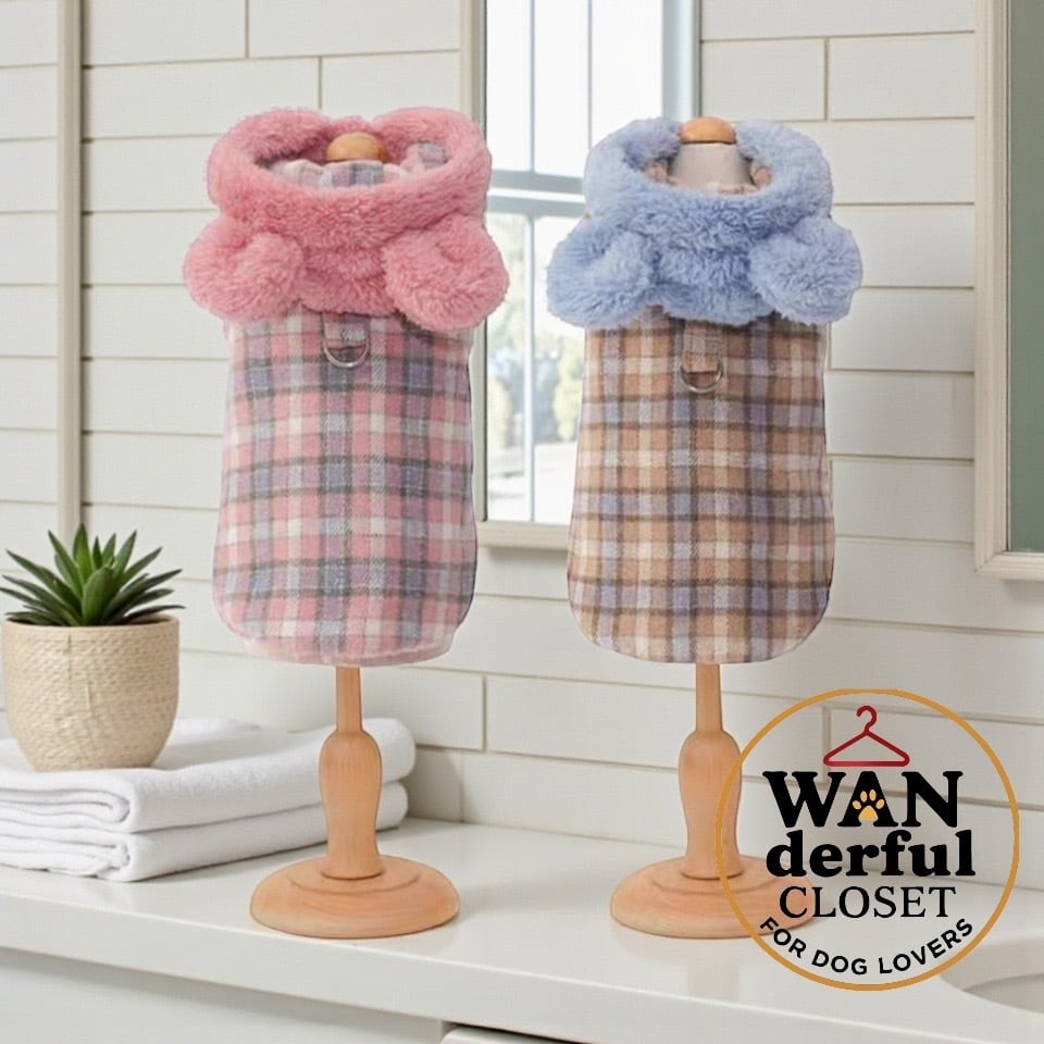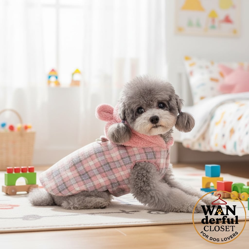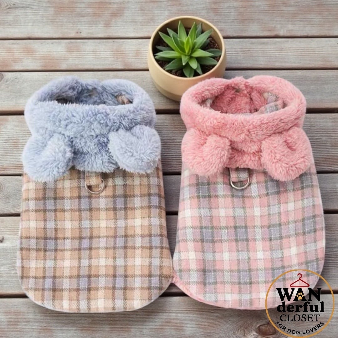 【小型犬・中型犬用|ぬくもりと可愛さを両立するチェックベスト&熊耳フード】